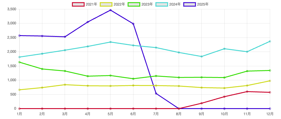 1番青い線が今年の投稿数推移です! 今年も順調にサービスとしては成長をしていて、上半期総投稿数の成長率は36.57%でした。 ◾️投稿数推移月別 月 2024年 2025年 1月 1813 2568 2月 1931 2553 3月 2055 2526 4月 2187 3046 5月 2342 3464 6月 2223 2983 もう少しあげたいな〜、、、、 ただ今のやり方のままでは、正直この数字から大幅に改善することはなかなか難しい現状です。現状維持になるので当たり前ですが。